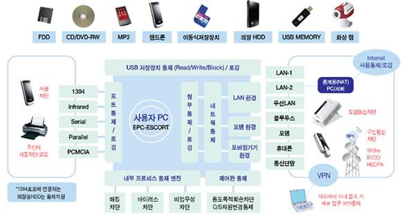 USB, 외장 HDD 등 저장장치 및 유, 무선 통신을 이용한 정보유출 위험을 제거하고 자료유출 예방 및 추적성을 확보함으로써