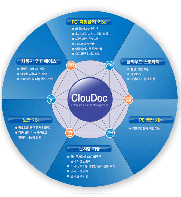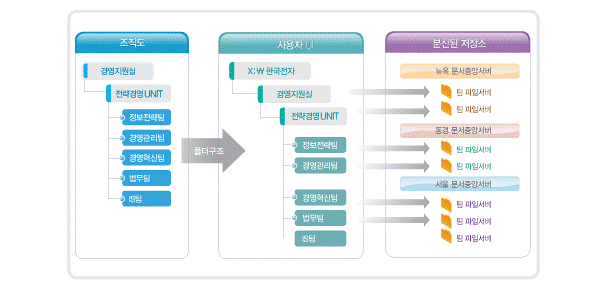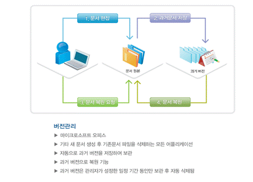 기업내 모든 문서, 도면, 영업정보 등을 중앙의 대용량 Storage 에 저장 함으로써 효율적인 전사자원관리와 내부정보의 유출을 방지합니다.