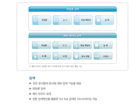 윈도탐색기에서 제공하는 기본적인 파일명 검색은 시스템의 성능과 응답시간에 영향을 미칠 수 있기 때문에 자체적인 파일명 검색기능을 제공합니다. 또한, 메타데이터 검색 기능도 제공합니다.