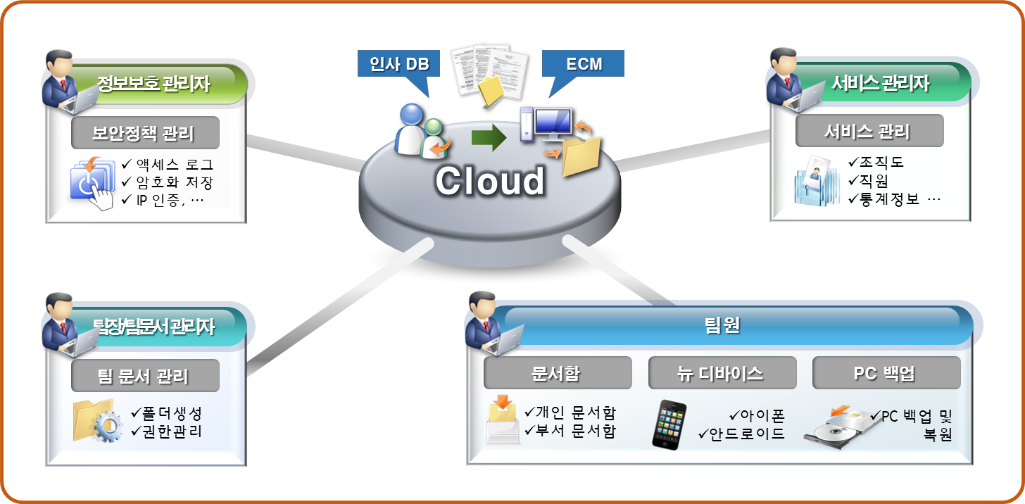 ECM 은 정보보호관리자와 서비스관리자 등의 중앙 관리 책임자, 그리고 각 부서별 팀장에 해당하는 폴더관리자와 일반 사용자 등의 구성원이 있습니다. 또한, 중앙의 인사DB 와 연동하는 경우 ECM 은 효율적인 협업 환경을 제공합니다.