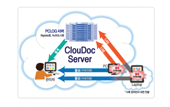 PC 로그를 이용한 통제 및 관리는 2013년 3.20 사태와 같은 사례 재발을 방지 할 수 있습니다. 해당 기능은 업무용 PC의 로그기록을 이용하여 정보 유출 및 삭제를 실시간으로 통제하며 관리자에게 즉시 통보합니다. 또한, 로그기록은 시각화하여 통계자료로도 제공하기 때문에 사내 문서 이용률 자료로 활용이 가능합니다.